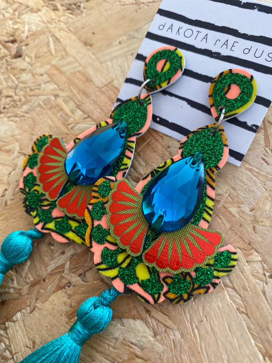 Dakota Rae Dust | Statement Jewel Tassel Earrings | Peach, Green & Blue
