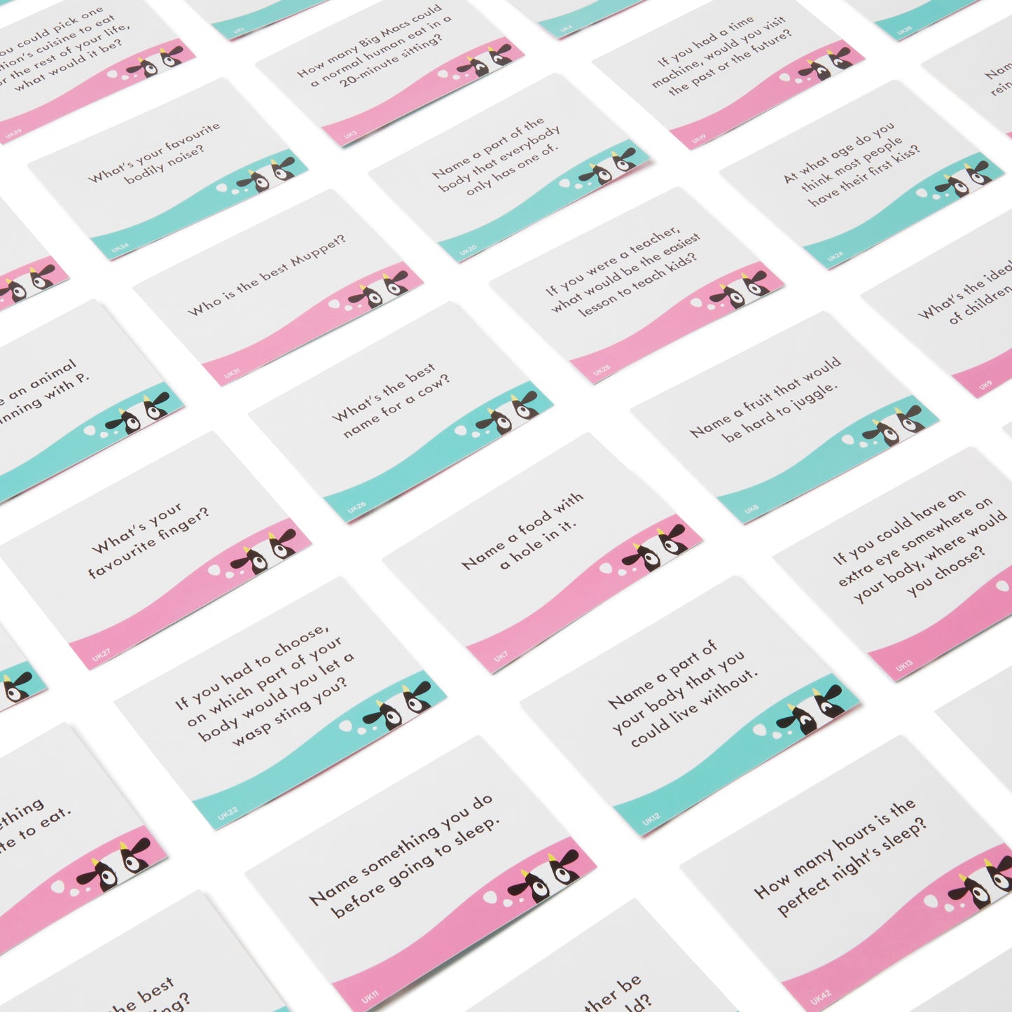 It starts with a random question, then everyone secretly writes down an answer. If your answer is in the majority, you win cows. But if your answer is the odd one out, you'll land the Pink Cow and your herd will be worthless — unless you can pass it on to someone else!