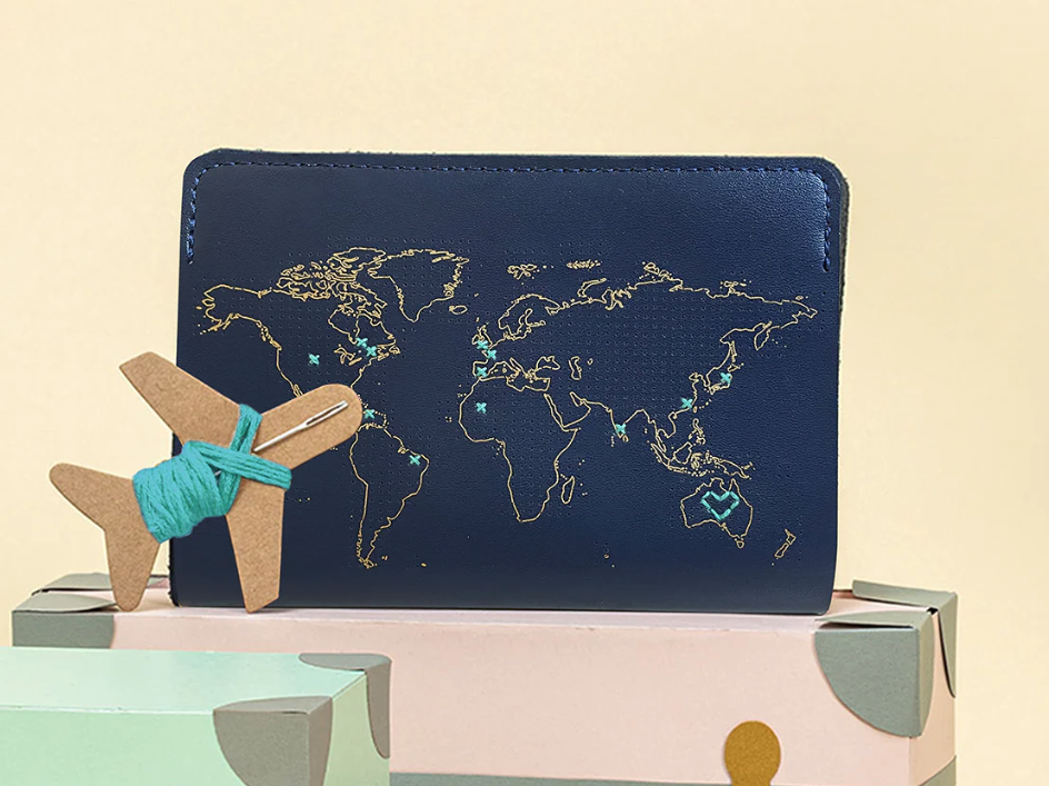 Show off your world travels with this luxurious navy faux leather cover which is printed with luxe gold world map and is specially perforated, so each country visited can be marked with a colourful cross. This beautiful navy passport cover is such a classic style with gorgeous gold detail. It comes with a ‘travel’ needle and teal thread included, wrapped on a cute aeroplane thread board.
