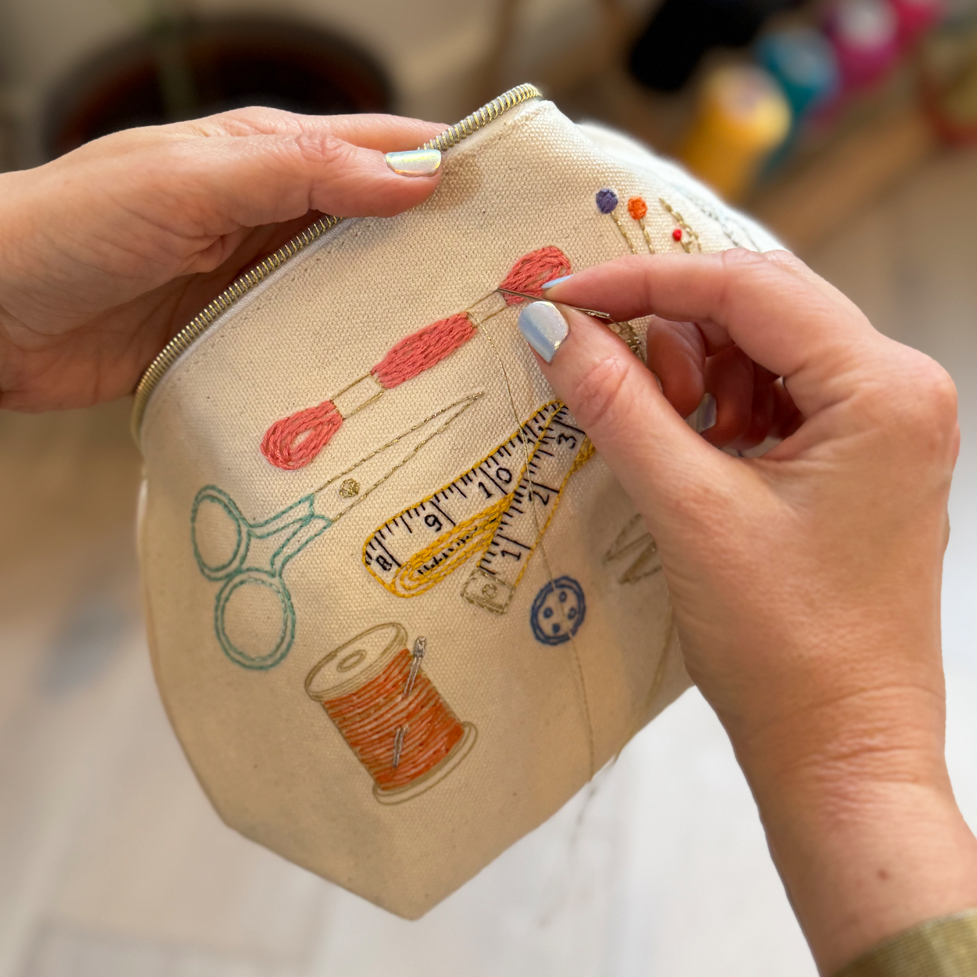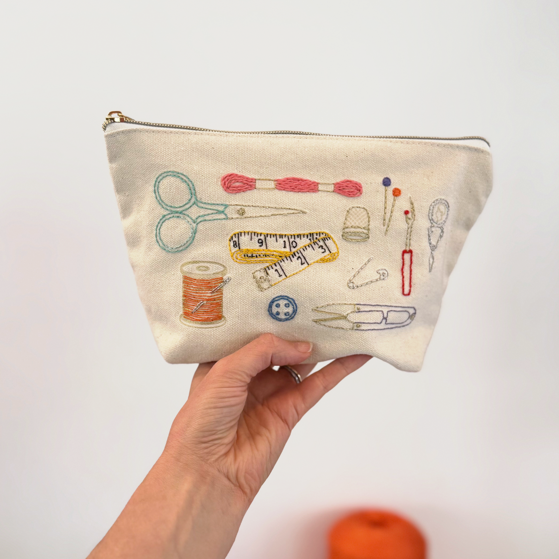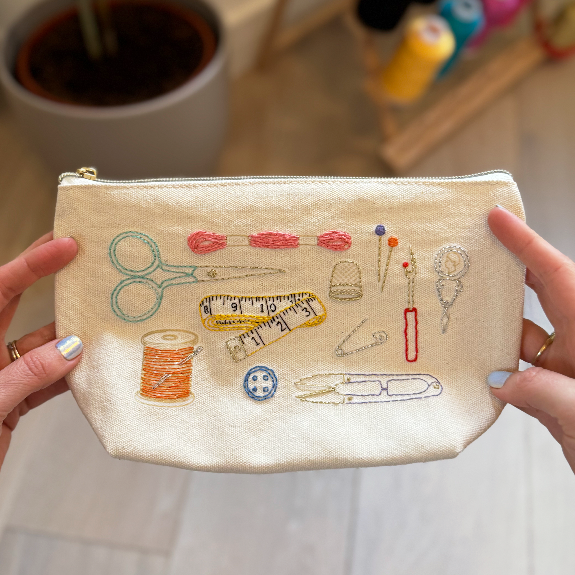 Born from the idea that your needlework projects should not be stuck at home in a drawer! Add colour to each tool and over time zip pouch flourishes into your own embroidered work of art.