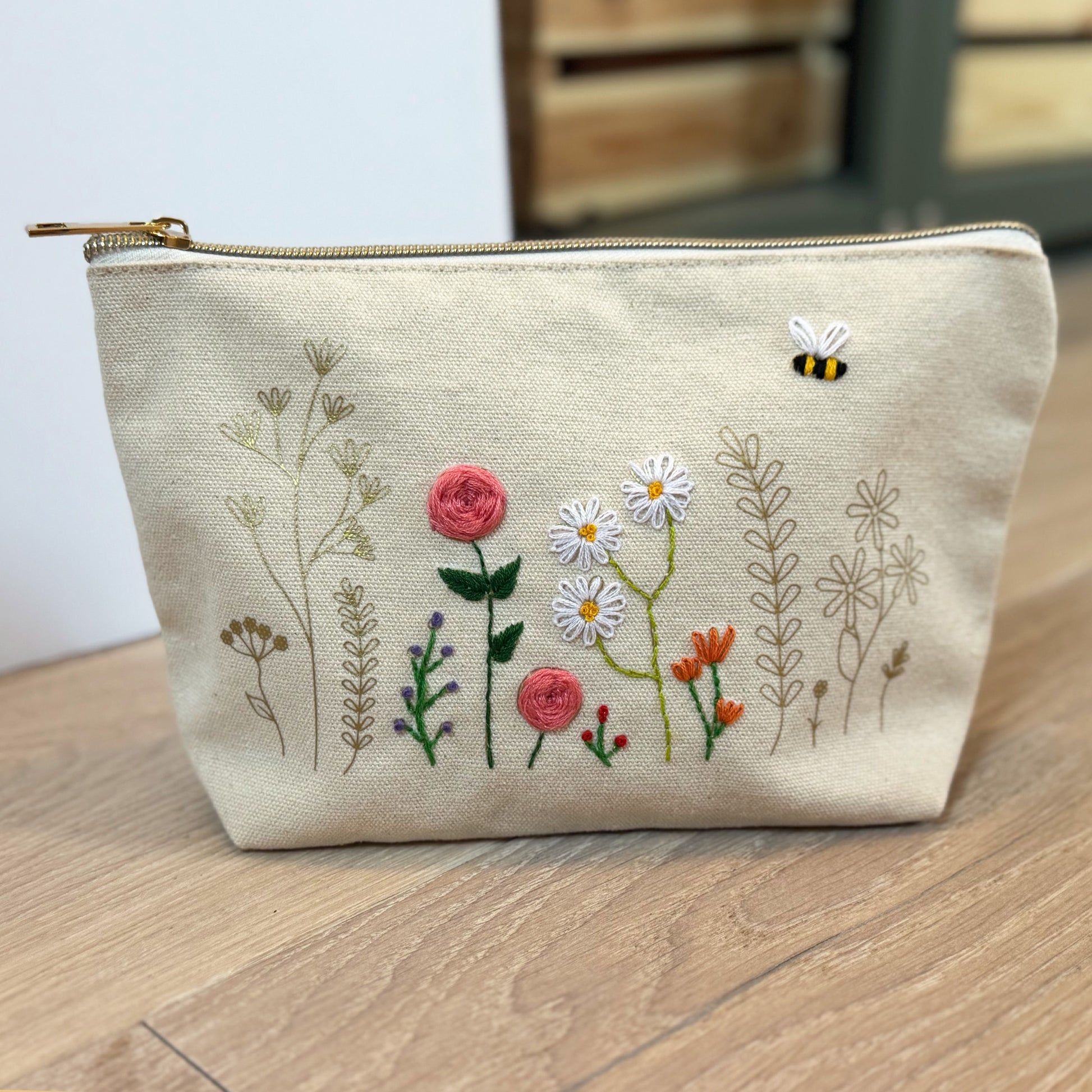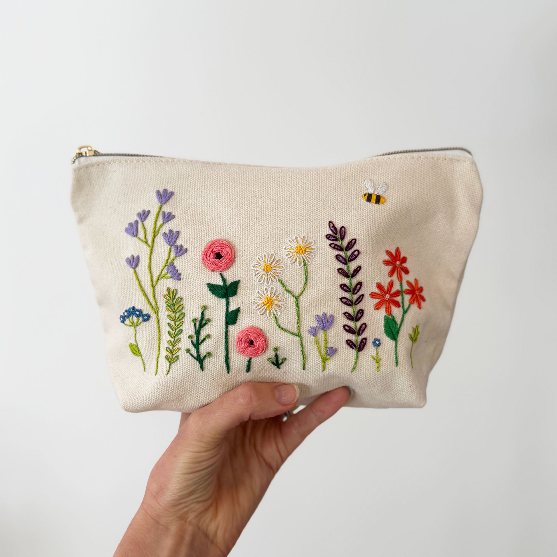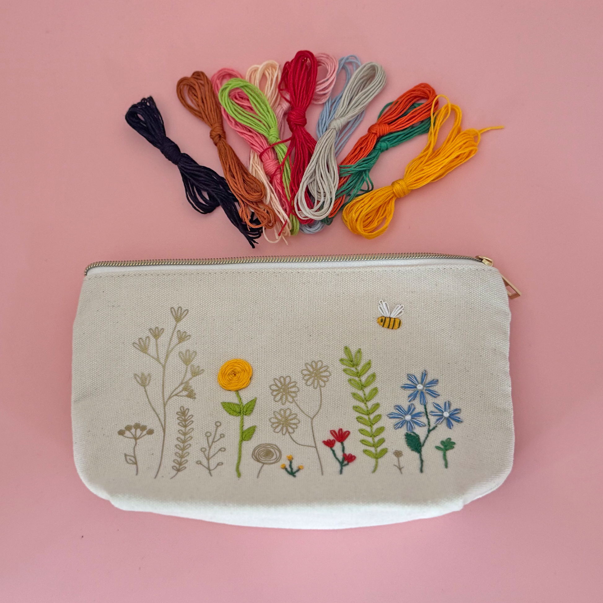 Born from the idea that your needlework projects should not be stuck at home in a drawer! Add colour to each flower one by one and over time zip pouch flourishes into your own embroidered work of art.