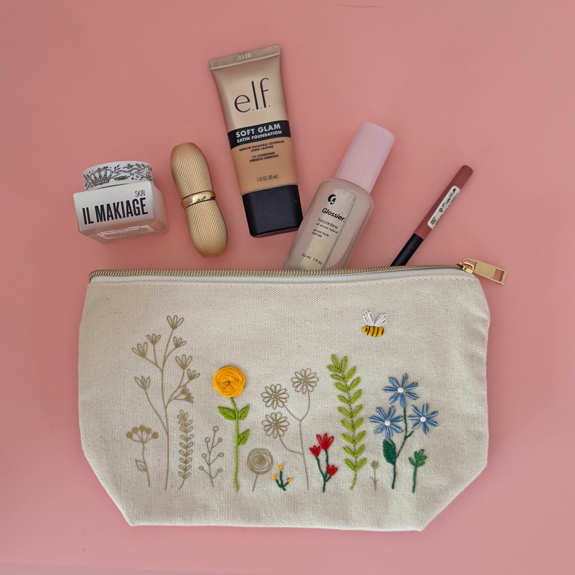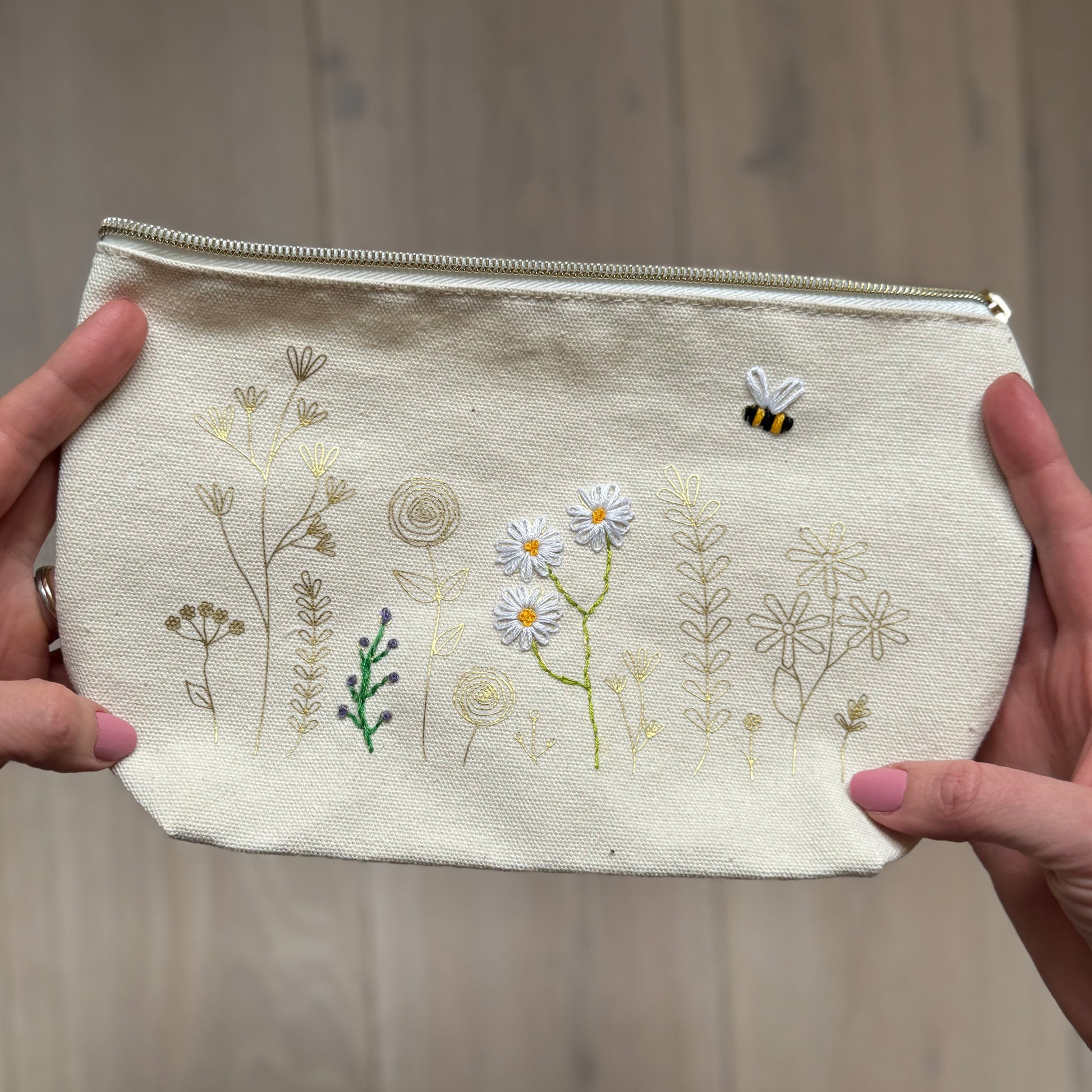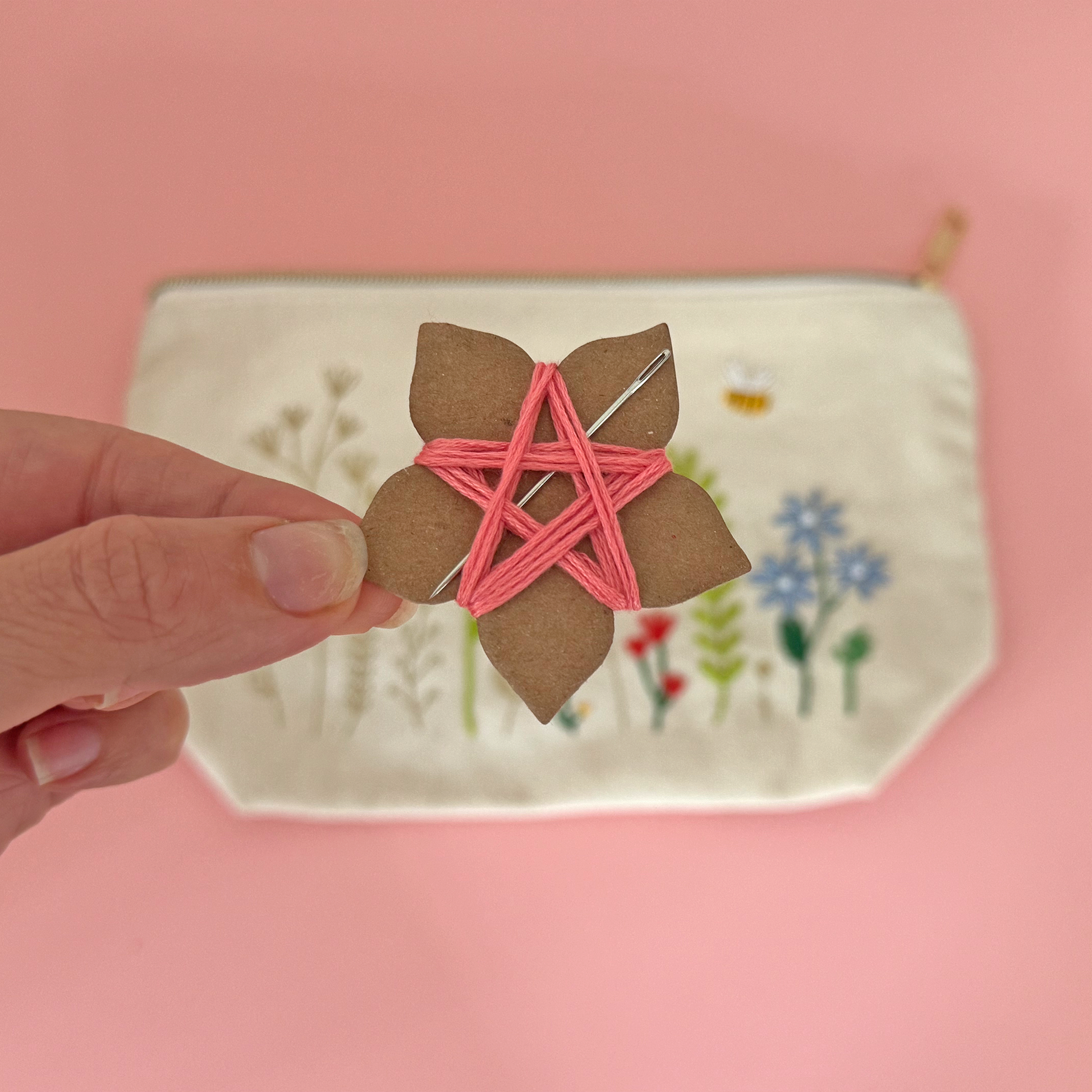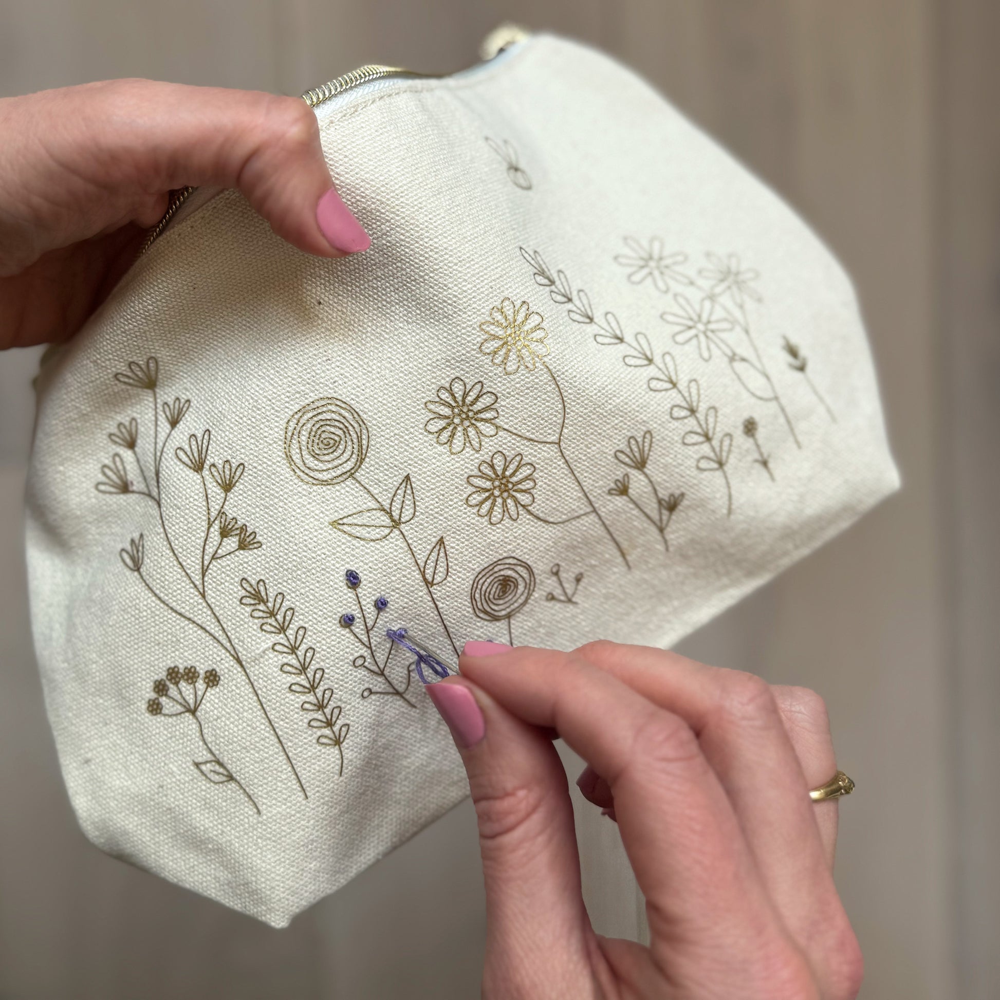 Born from the idea that your needlework projects should not be stuck at home in a drawer! Add colour to each flower one by one and over time zip pouch flourishes into your own embroidered work of art.