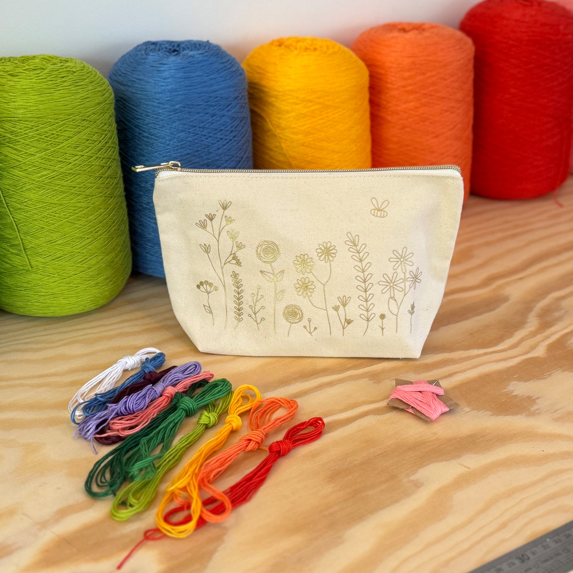 A DIY pouch kit that flourishes as you sew over the gorgeous flowers and bring the canvas pouch to life with colourful embroidery!