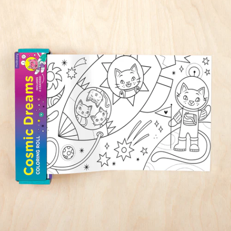 The Cosmic Dreams Mini Colouring Roll from Mudpuppy features cats cartwheeling through space looking for someone to add some colour to their world! Perfect for travel and on the go fun, crayons included!