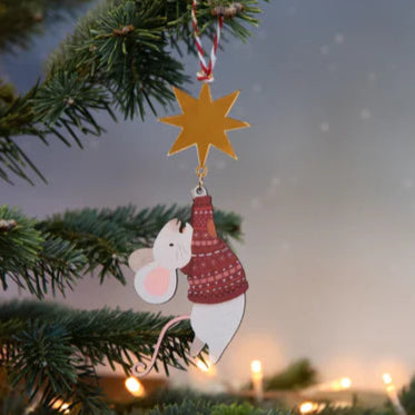 Hand designed mouse wooden decoration with shiny gold star, perfect for Christmas. Made from sustainably sourced maple wood.