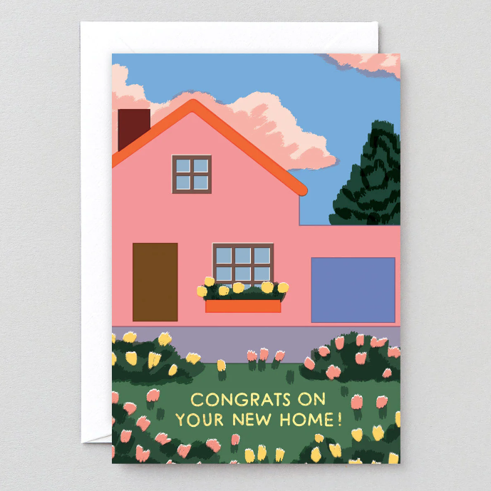 Home sweet home! This dreamy pretty-in-pink greetings card is perfect for those new house well wishes. Designed in a bright and colourful style, and finished with gold foil detailing.