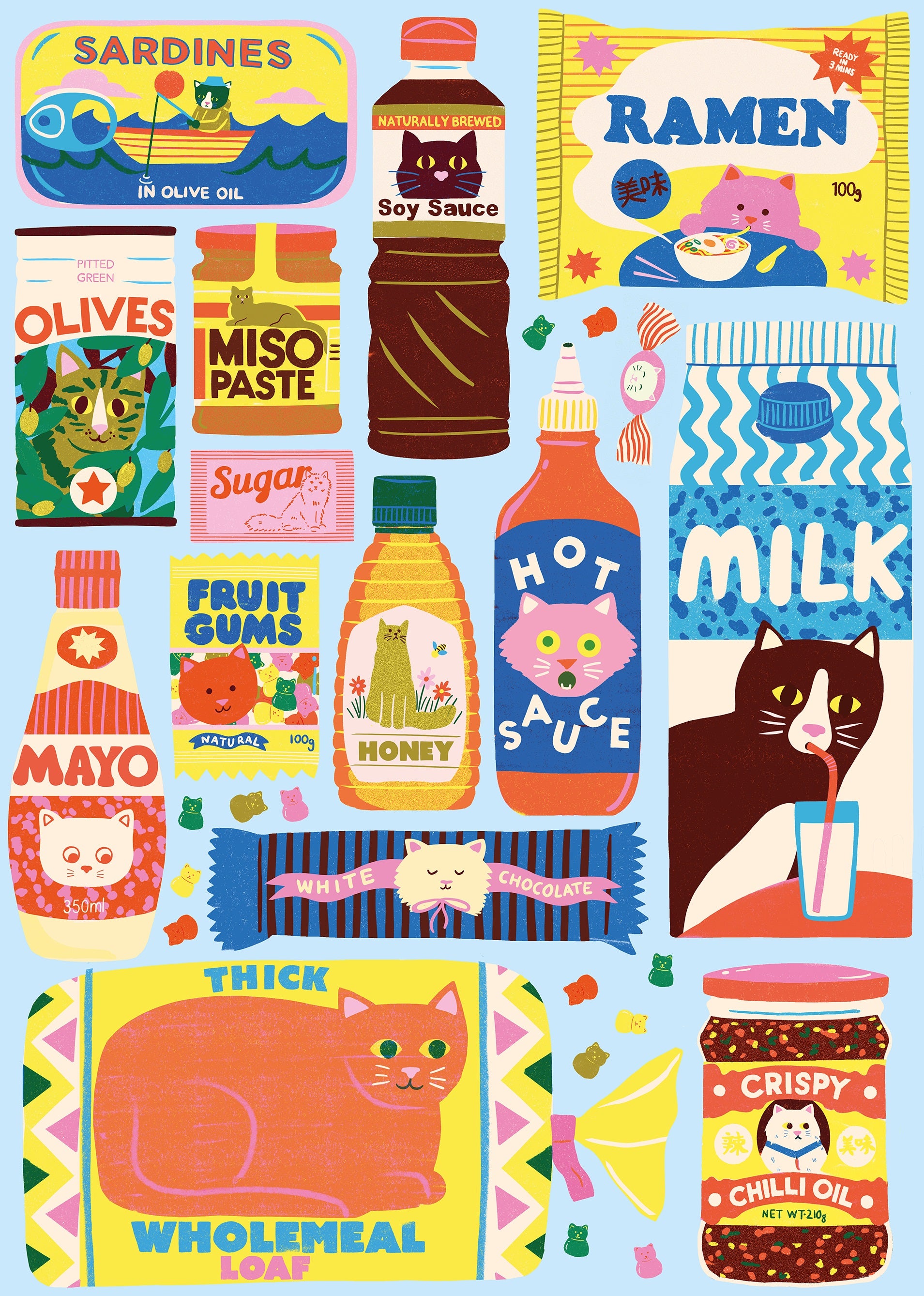 A 1,000 piece contemporary puzzle featuring illustrated ‘cat food’ by Naomi Wilkinson. Finished puzzle size: 68 x 48.5cm. Manufactured in the Netherlands using vegetable-based inks, sustainably sourced paper, recycled board and are 100% plastic free. Happily also plant a
