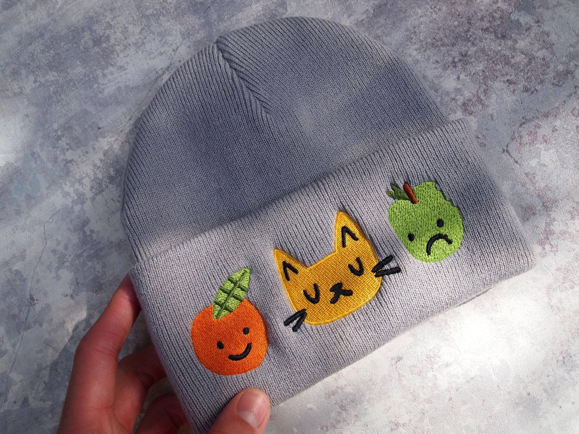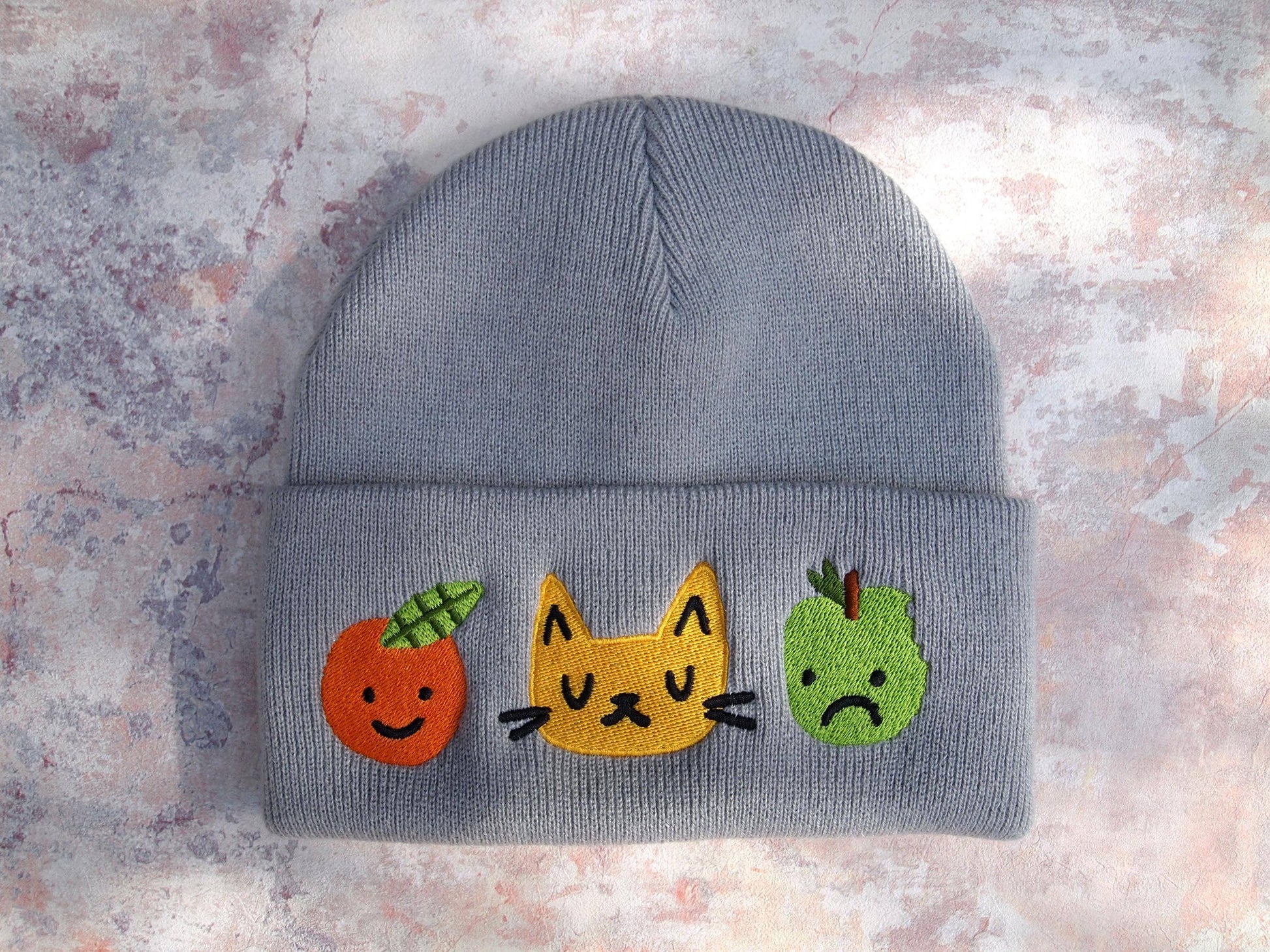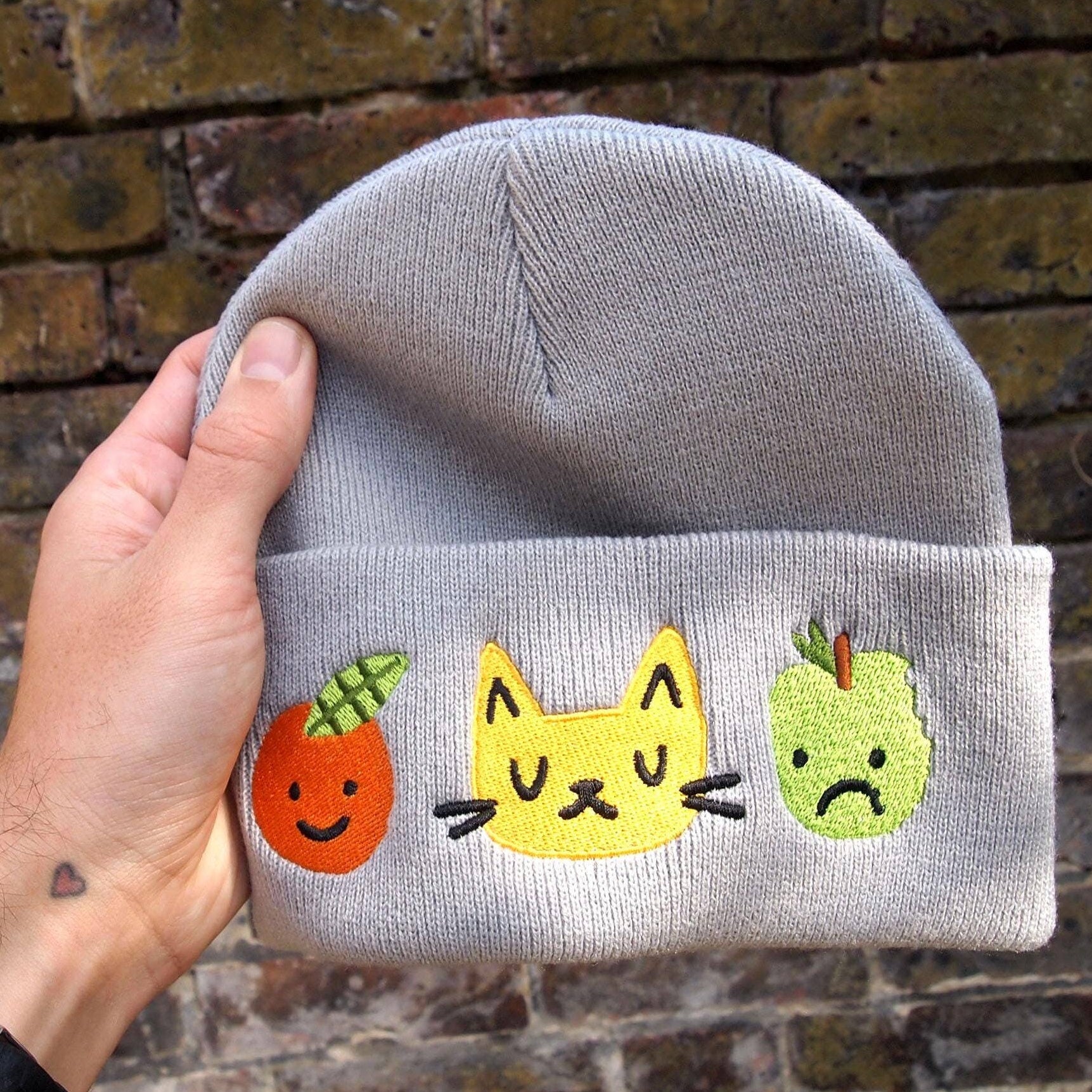 Cat embroidered beanie hat, cat with fruits embroidered beanie, knitted beanie hat, grey Stay warm and cute through the colder months with this stylish soft grey knitted beanie hat, embroidered with my illustrations of a cat with fruits.