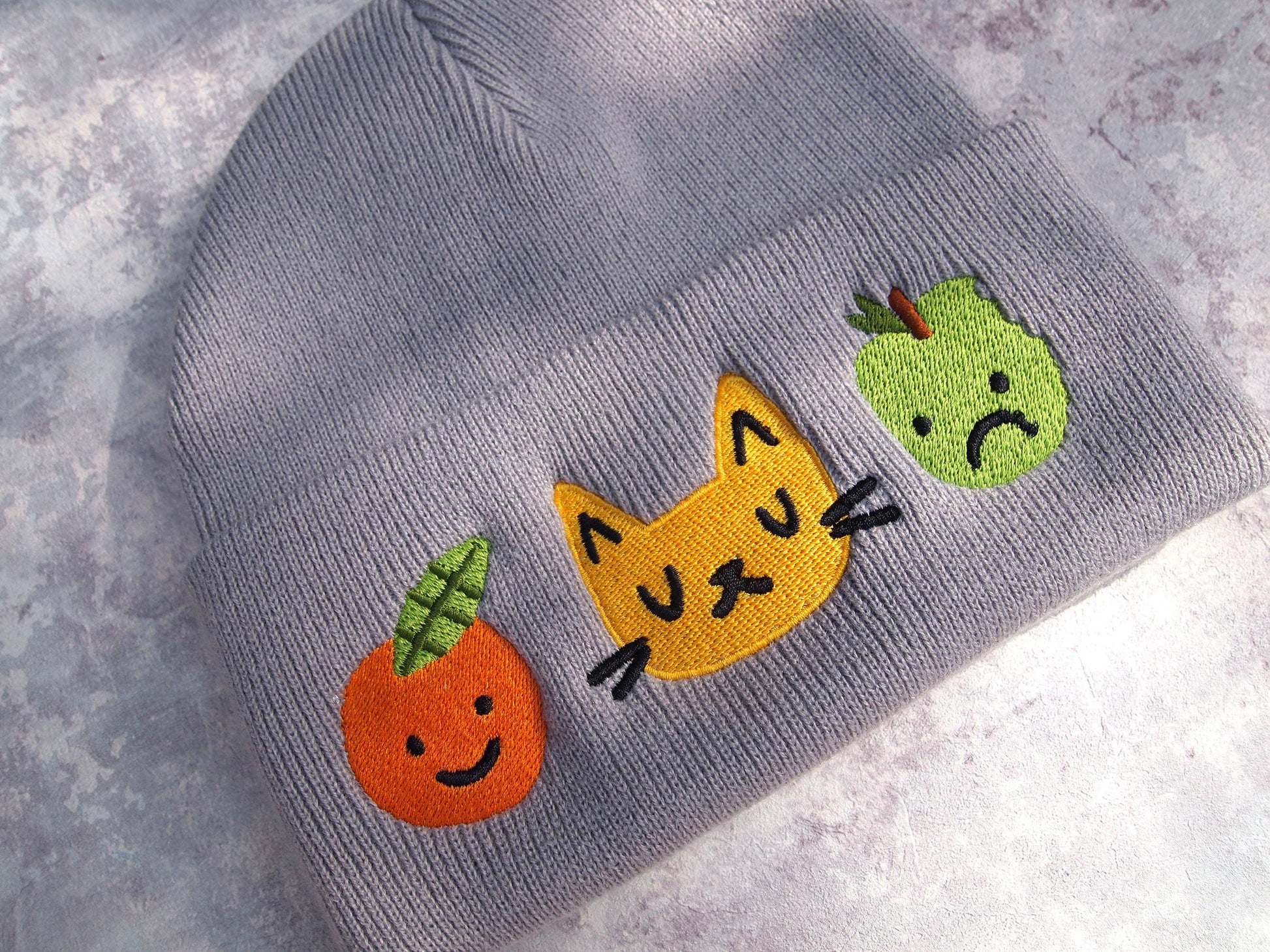 Theres a happy orange and a sad green apple with a big bite taken from it. The cat face in the middle is super cute and embroidered in a yellow thread, complimenting all of the colours of the hat and other motifs. The beanies are made from 100% soft-touch acrylic in a double layer knit, and finished with the machine embroidered design. Gender neutral for everyone to wear and enjoy.