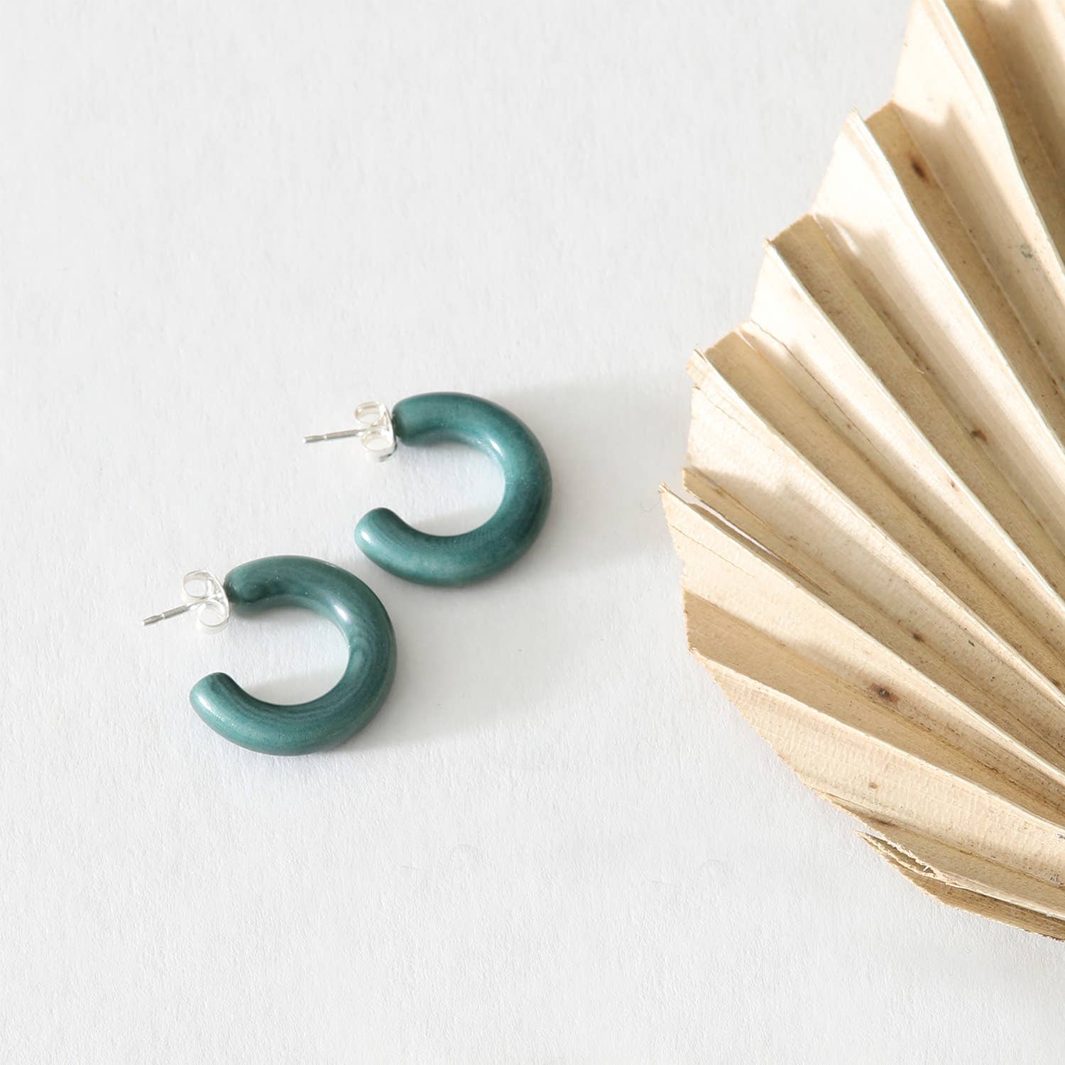 This minimalist collection shows off the natural characteristics of the tagua seed and is a collaboration between artisan makers from South America. From her studio in Ecuador, Magdalena skillfully carves and dyes each tagua component. Simple brass forms are hand cut by the women at the Hope Jewellery project in Peru and assembled with the tagua components.
