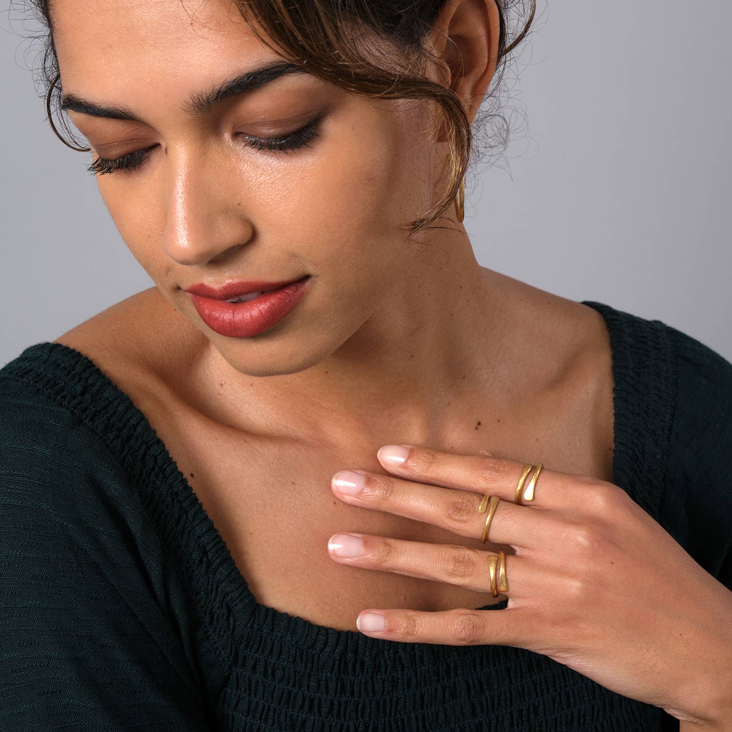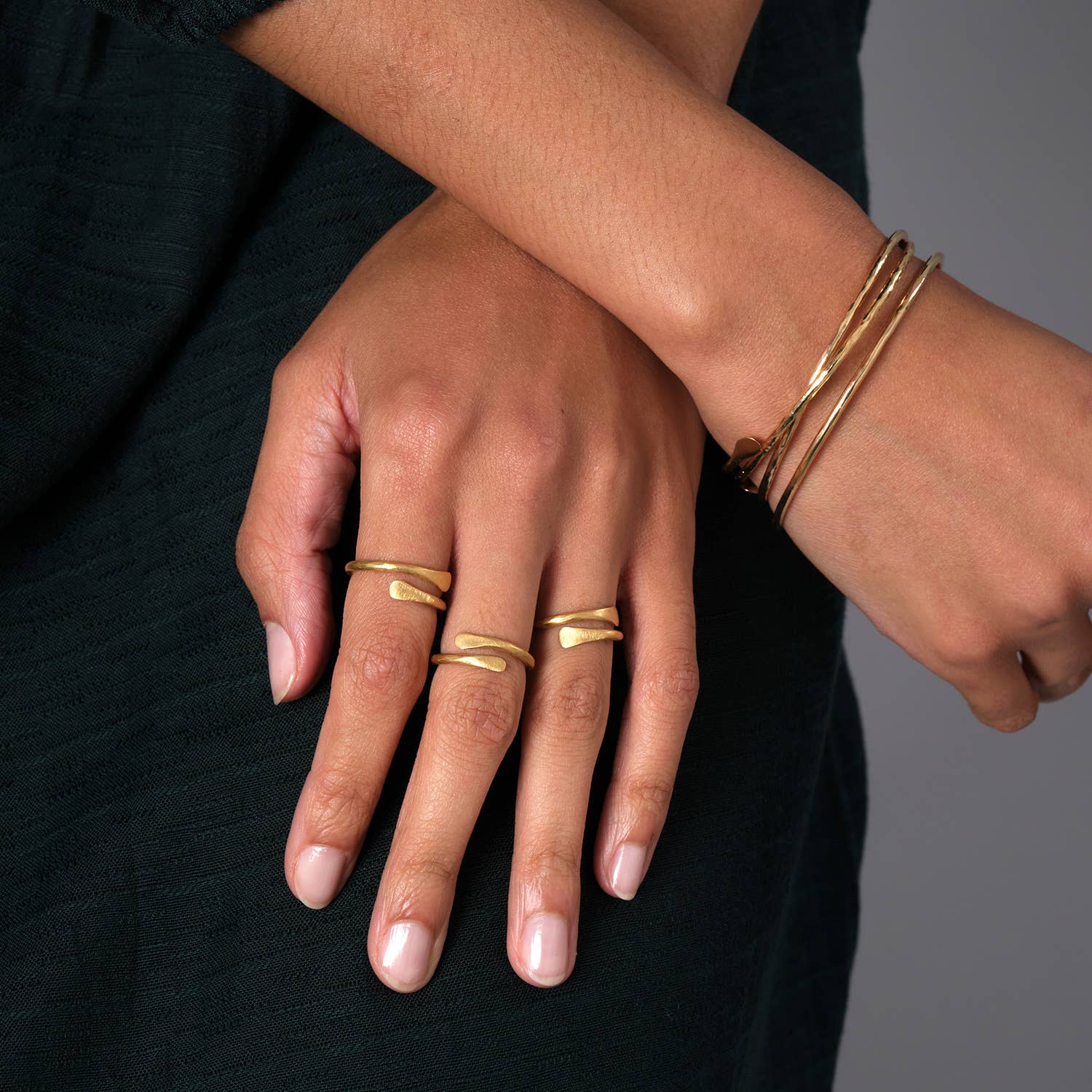 Strips of brass rod are skilfully hammered to create the subtle light-catching texture and round form of each piece. The collection is finished with a layer of plating in either sterling silver or 22ct gold. Handmade by the women at the Flowering Desert Project in India.