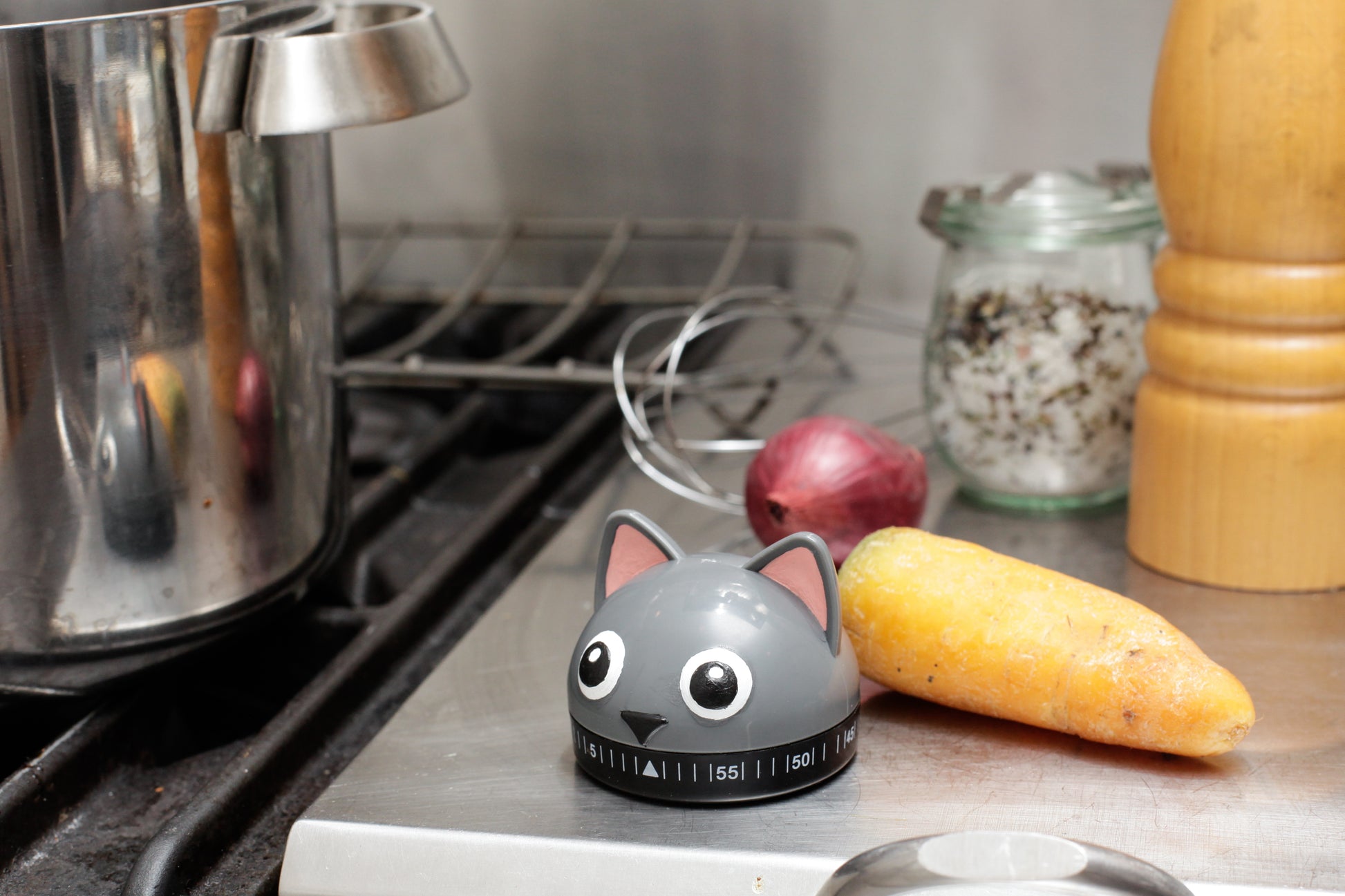 Add a little natural whimsy into your kitchen. This kitty timer keeps track of cooking time in one minute increments for up to sixty minutes. No batteries necessary, simply hand wind the clock and a pleasant ding will signal you're eggs are done.
