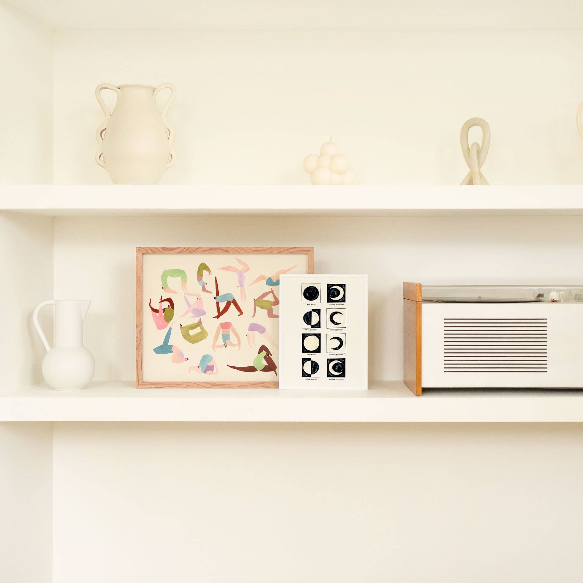 A print capturing the beauty and mystery of the moon’s ever-changing phases, featuring a contrasting black and white design that was originally a paper crafted collage. Each phase has been illustrated delicately and will add a touch of luna magic to your living space.