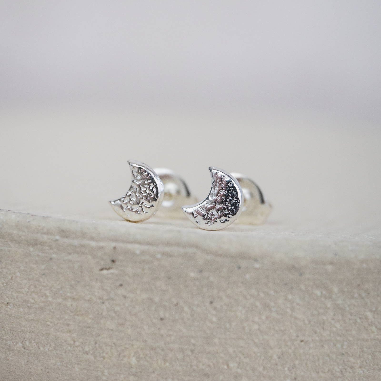 Handmade sterling silver mini moon studs are hand cut and delicately textured and are perfect for everyday wear. Each sterling silver mini moon stud measures approximately 5mm along the side.