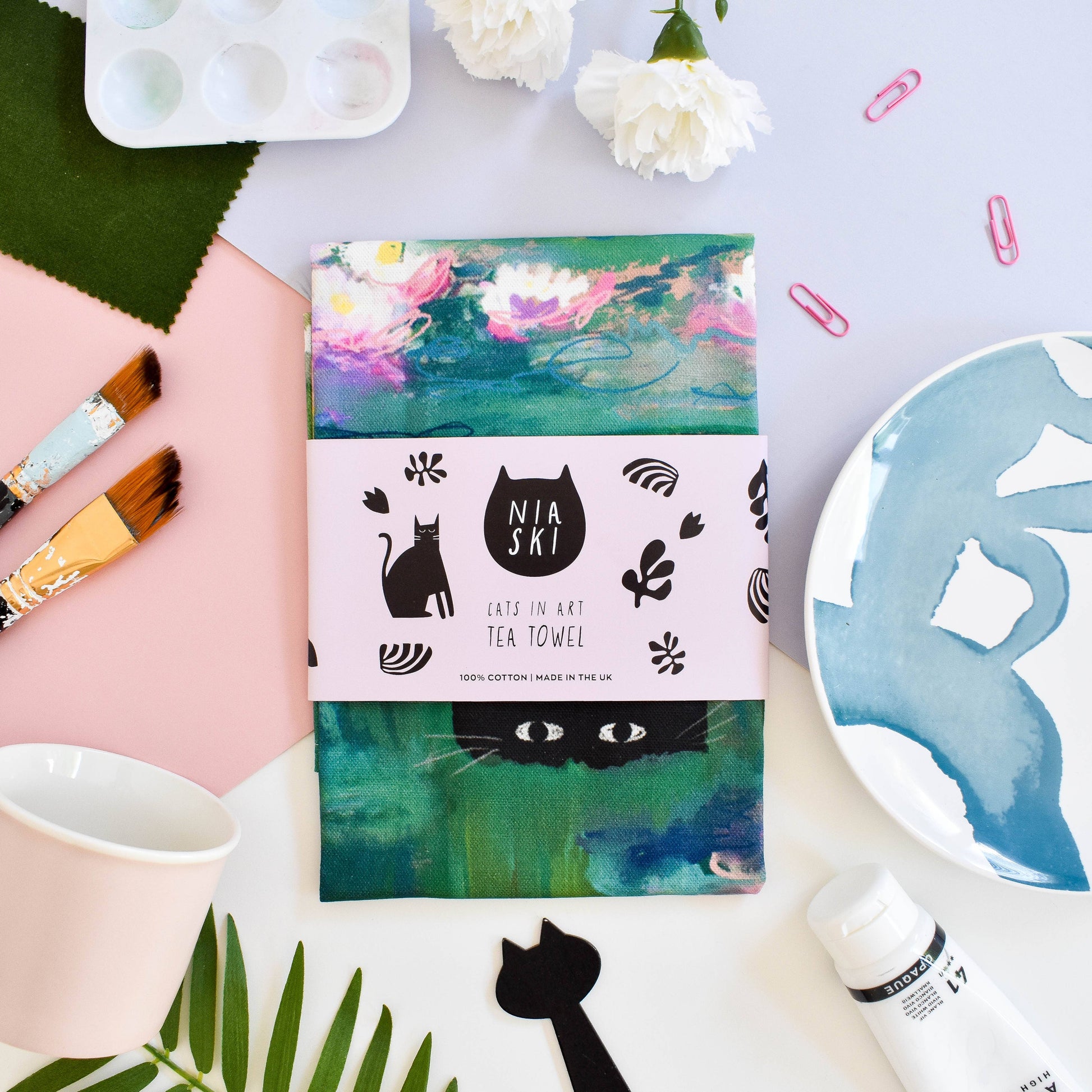 The 'Monet Cat' tea towel is a feline interpretation of artwork by legend, Claude Monet now reimagined as 'Monet Cat’ Combining a love of cats and a passion for art, illustrator and designer Nia Gould (‘Niaski’) has created a punny homeware range celebrating the life and times of artistic felines. 100% quality cotton tea towel. Dimensions: 69cm x 46cm
