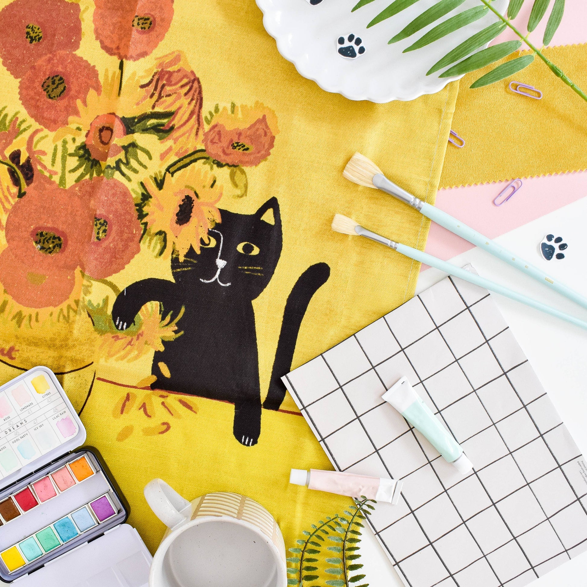The 'Sunflower Cat' tea towel is a feline interpretation of artwork by legend, Vincent Van Gogh now reimagined as 'Vincat Van Gogh’ Combining a love of cats and a passion for art, illustrator and designer Nia Gould (‘Niaski’) has created a punny homeware range celebrating the life and times of artistic felines. 100% quality cotton tea towel. Dimensions: 69cm x 46cm