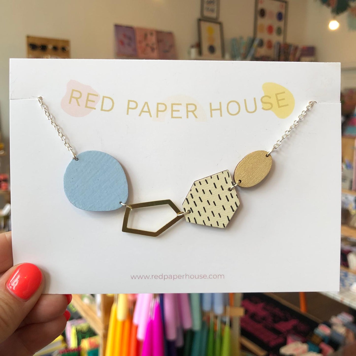 Each shape began as a hand drawing which are then laser cut from responsibly sourced birch wood, hand sanded and hand painted then finished to create the necklace.