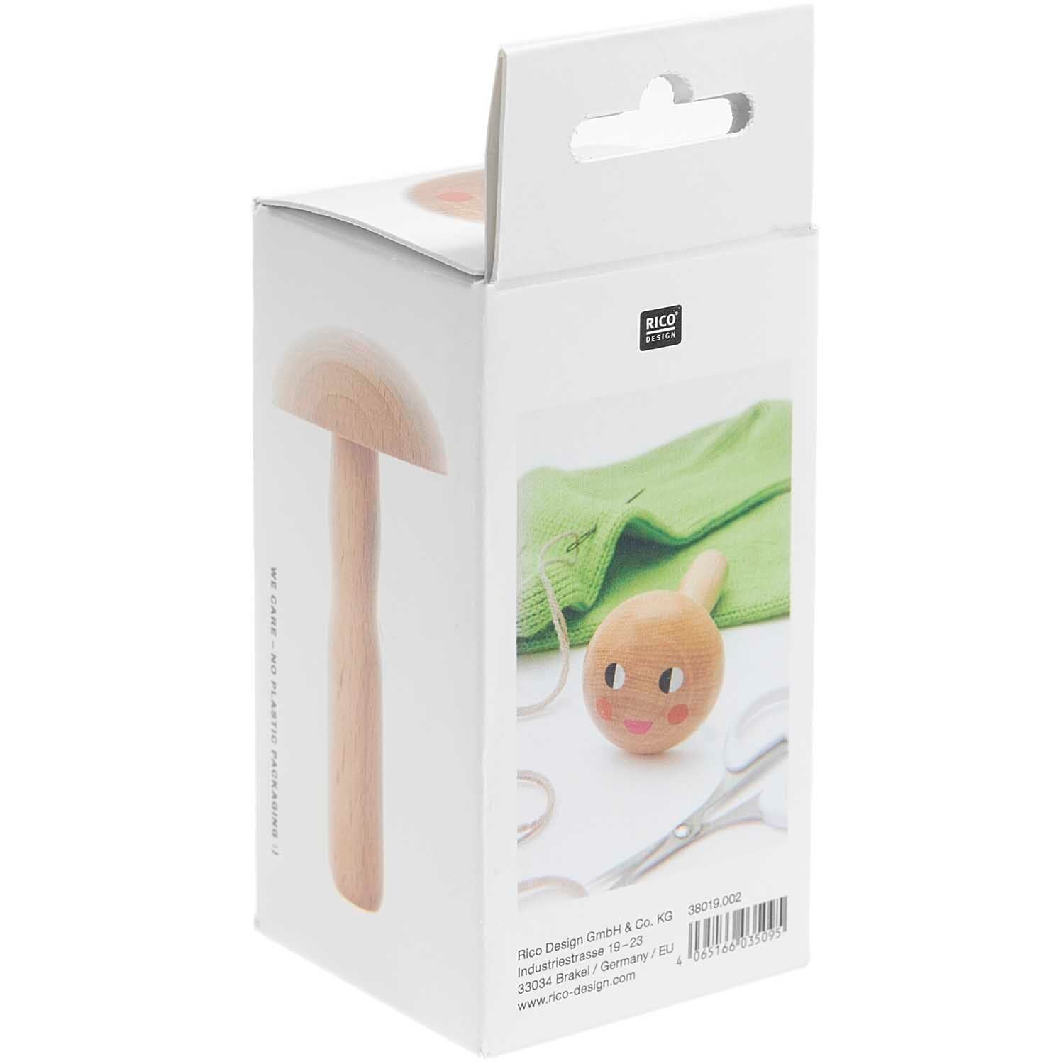 Sustainability and environmental awareness also include mending broken garments. The darning mushroom with a funny face is made of wood and is sold in plastic-free packaging.