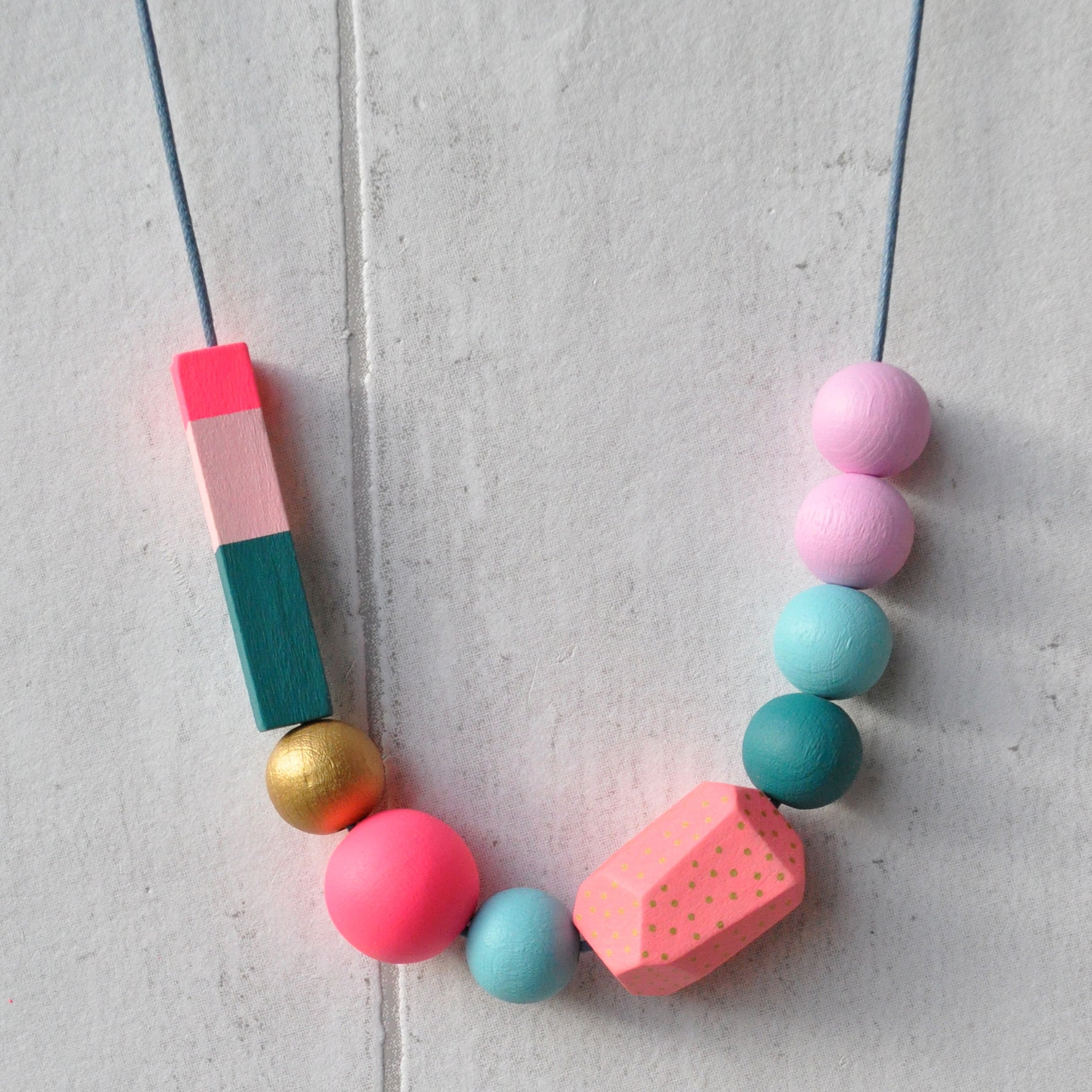 Lovely jewel coloured bead necklace in coral with neon pink, gold and jade accent beads.
