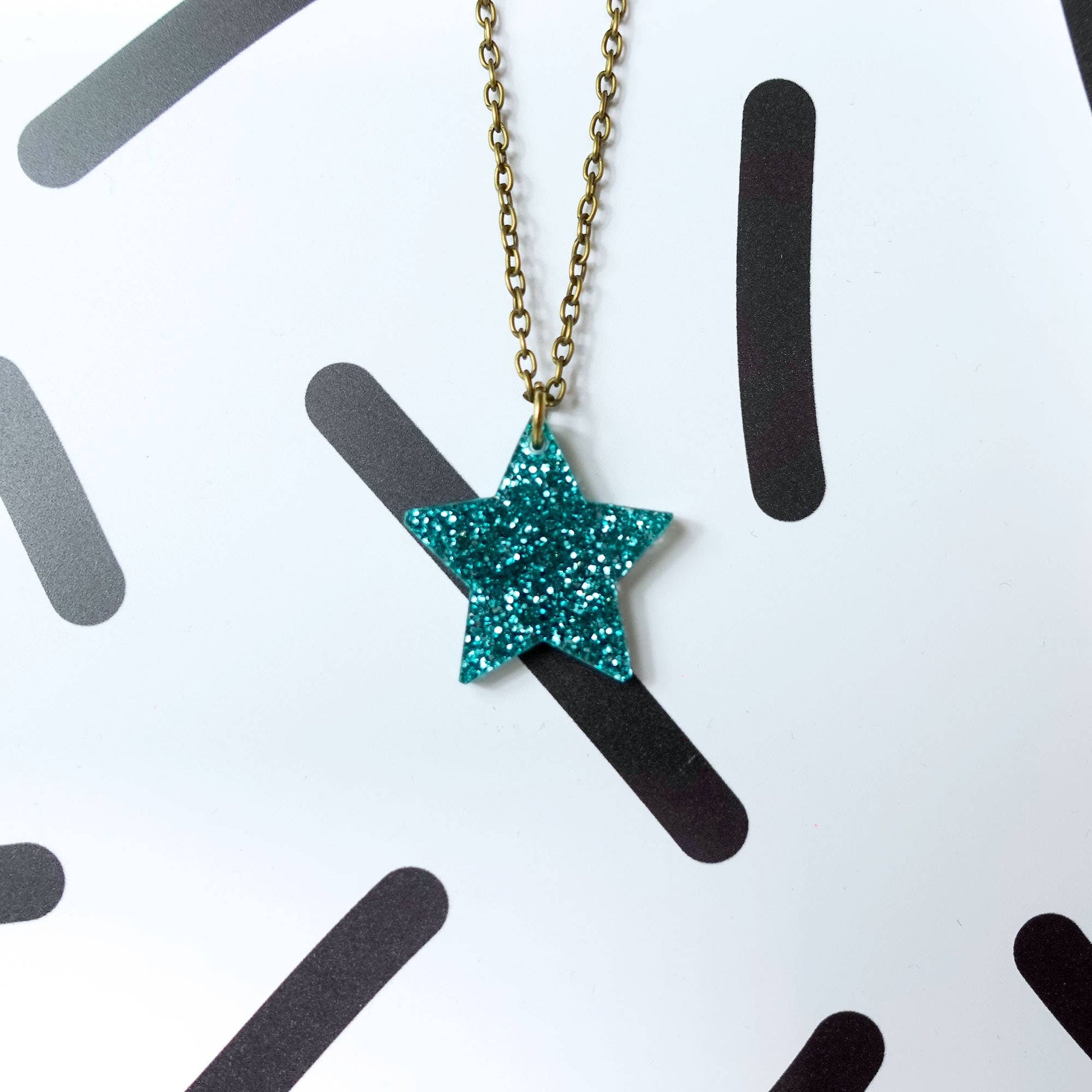 A glittery star shape hanging from a gold coloured chain. The design features a glossy glittery star, available in 3 colour options; Pink, Teal and Rainbow. All our designs are hand drawn by our designer, Sophie so they are completely unique. All jewellery is handmade in Leeds, UK Cut from Perspex acrylic Nickel free metal chain made from iron - hypoallergenic for sensitive skin Measuring approximately 25mm x 25mm on a 45cm chain. Packaged on a branded card, within a colourful gift box.