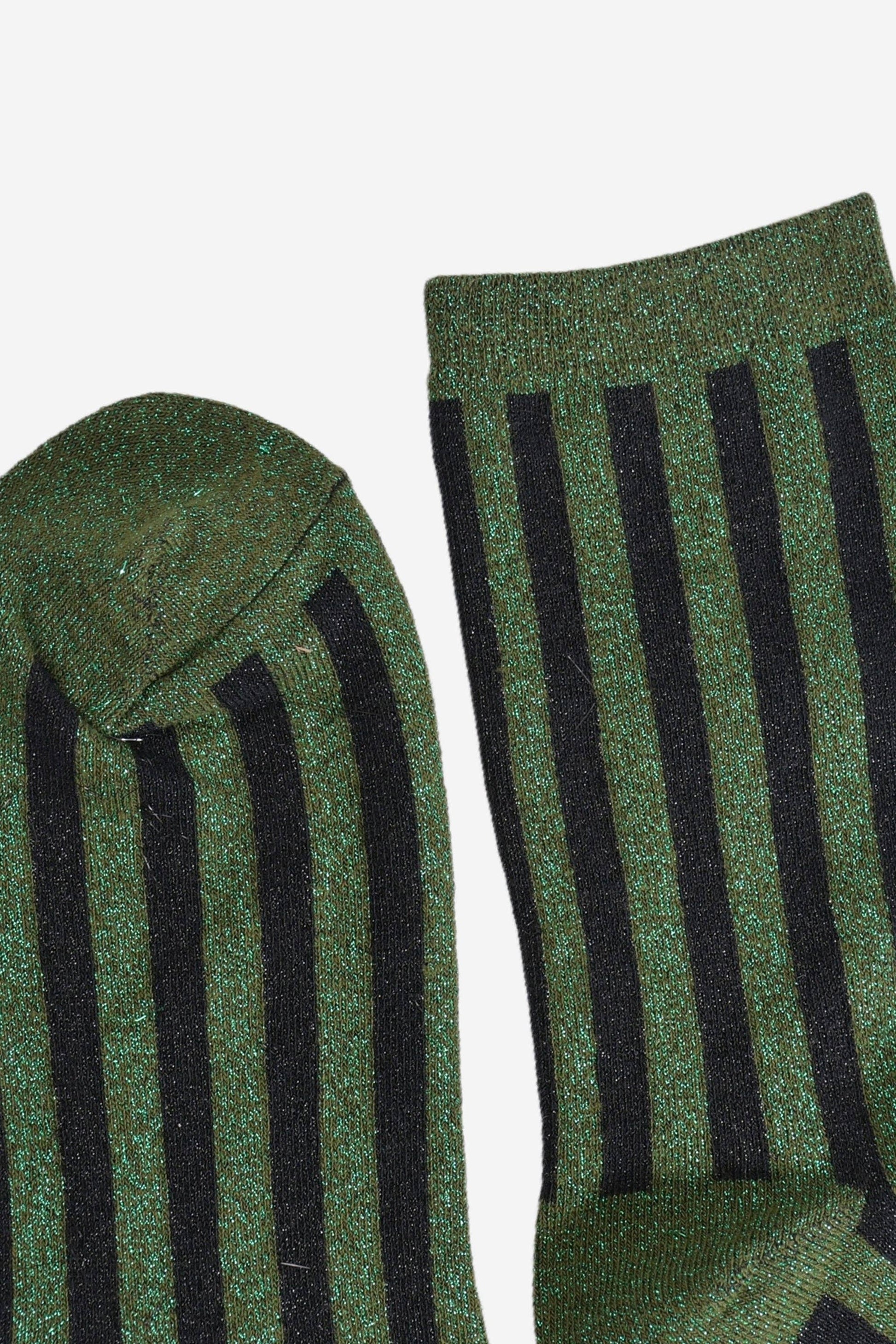 Designed in the UK, these glitter socks are crafted from soft blended cotton. Showcasing contrasting khaki and black vertical stripes and an eye-catching sparkle, these socks are naturally breathable, fun and luxurious. Women's ankle sock UK 3-7 | EU 36-40 | US 5 Crafted from soft natural cotton infused with delicate metallic fibres. The fabric feels soft and breathable on the skin. Due to the manufacturing process, there may be some loose glitter threads. 60% Cotton, 25% Polyester, 10% Metal Wire, 5% Spandex Made in China